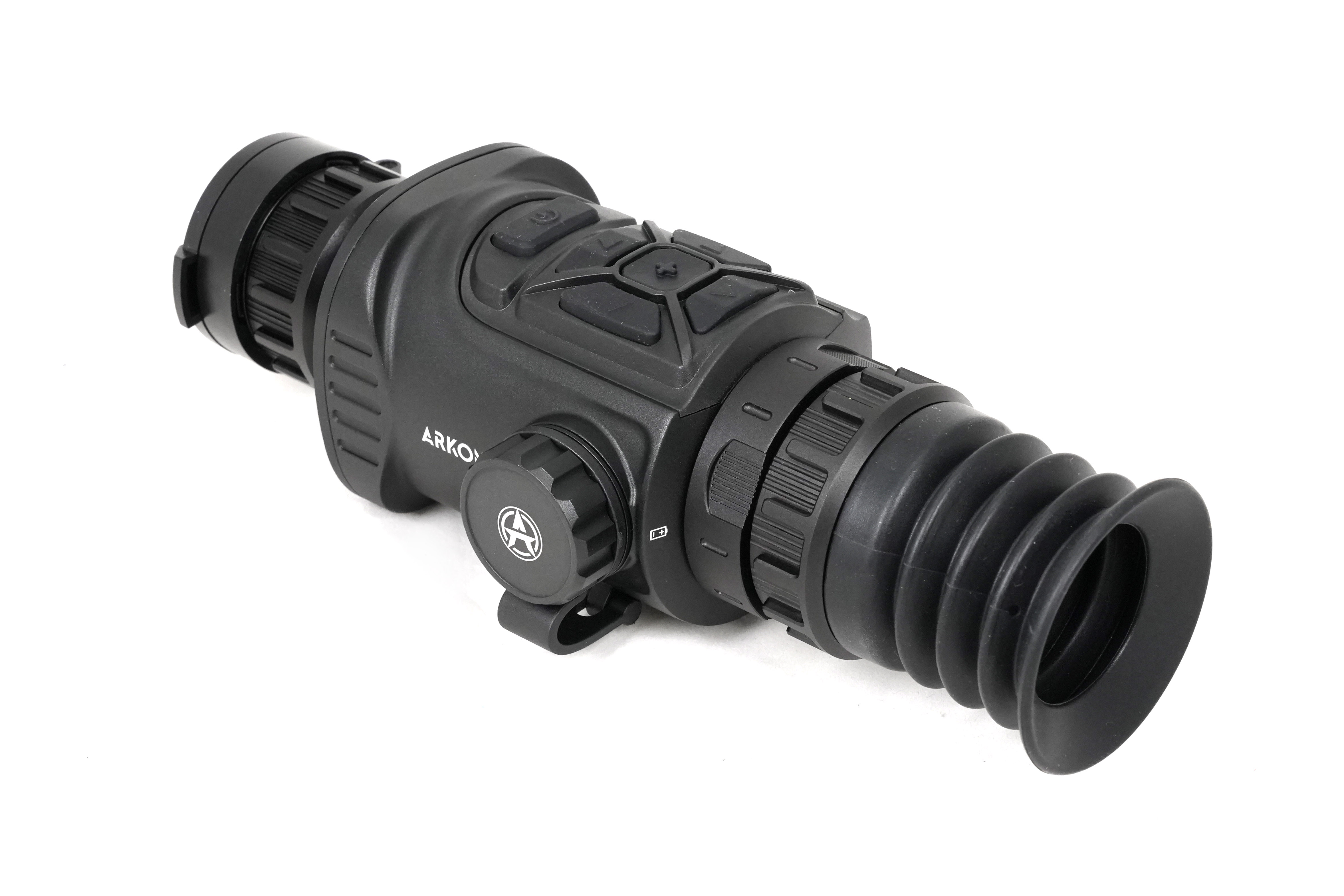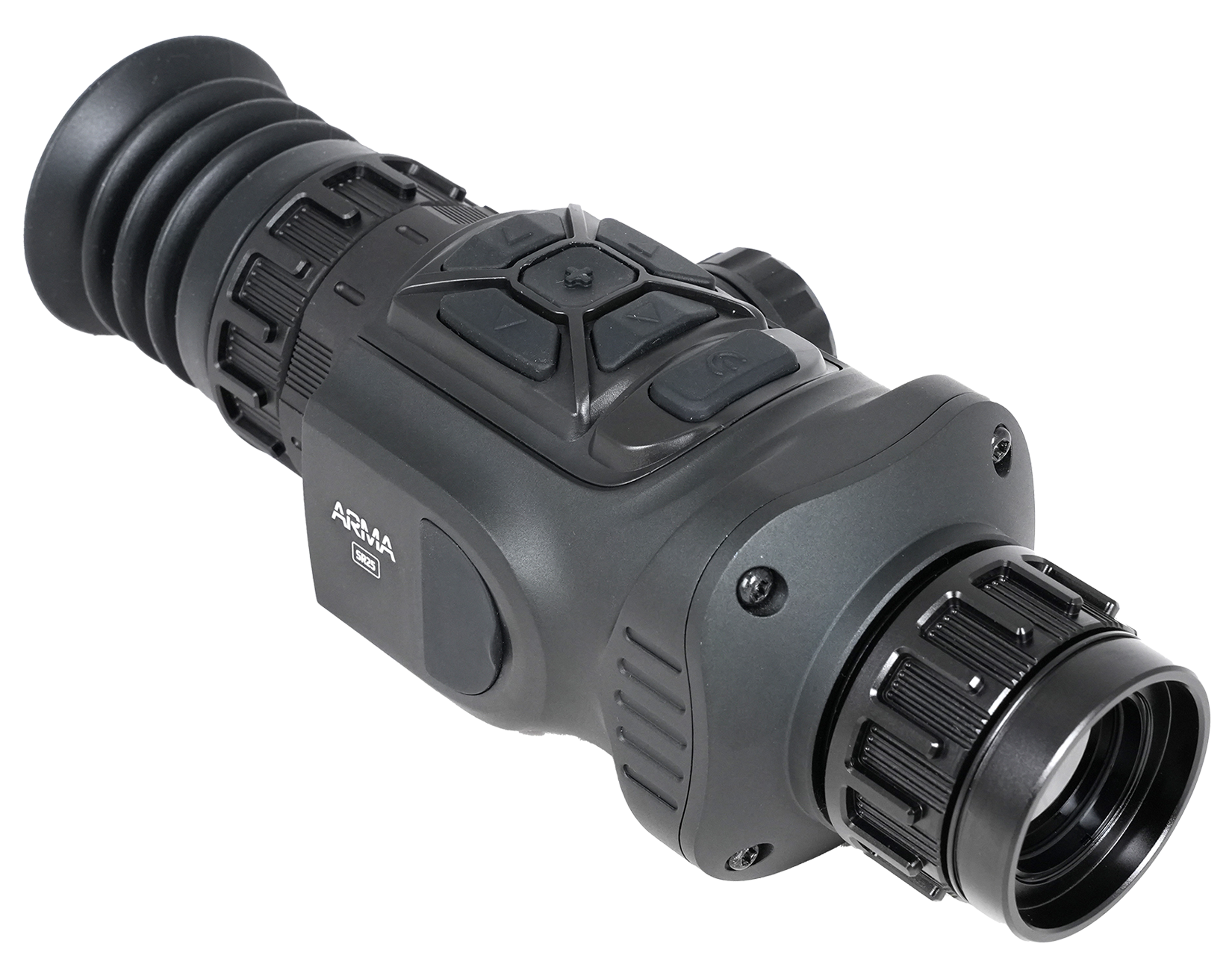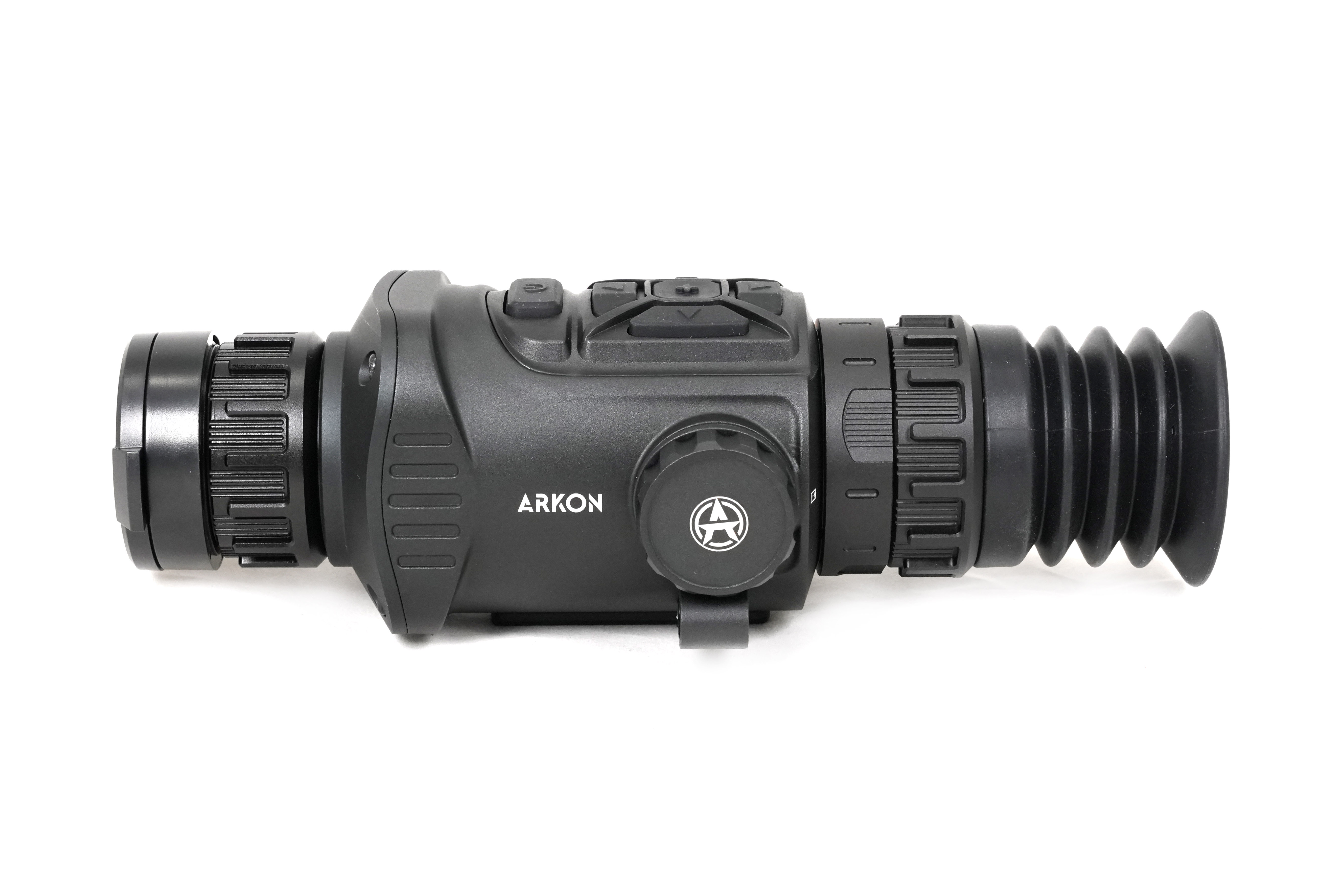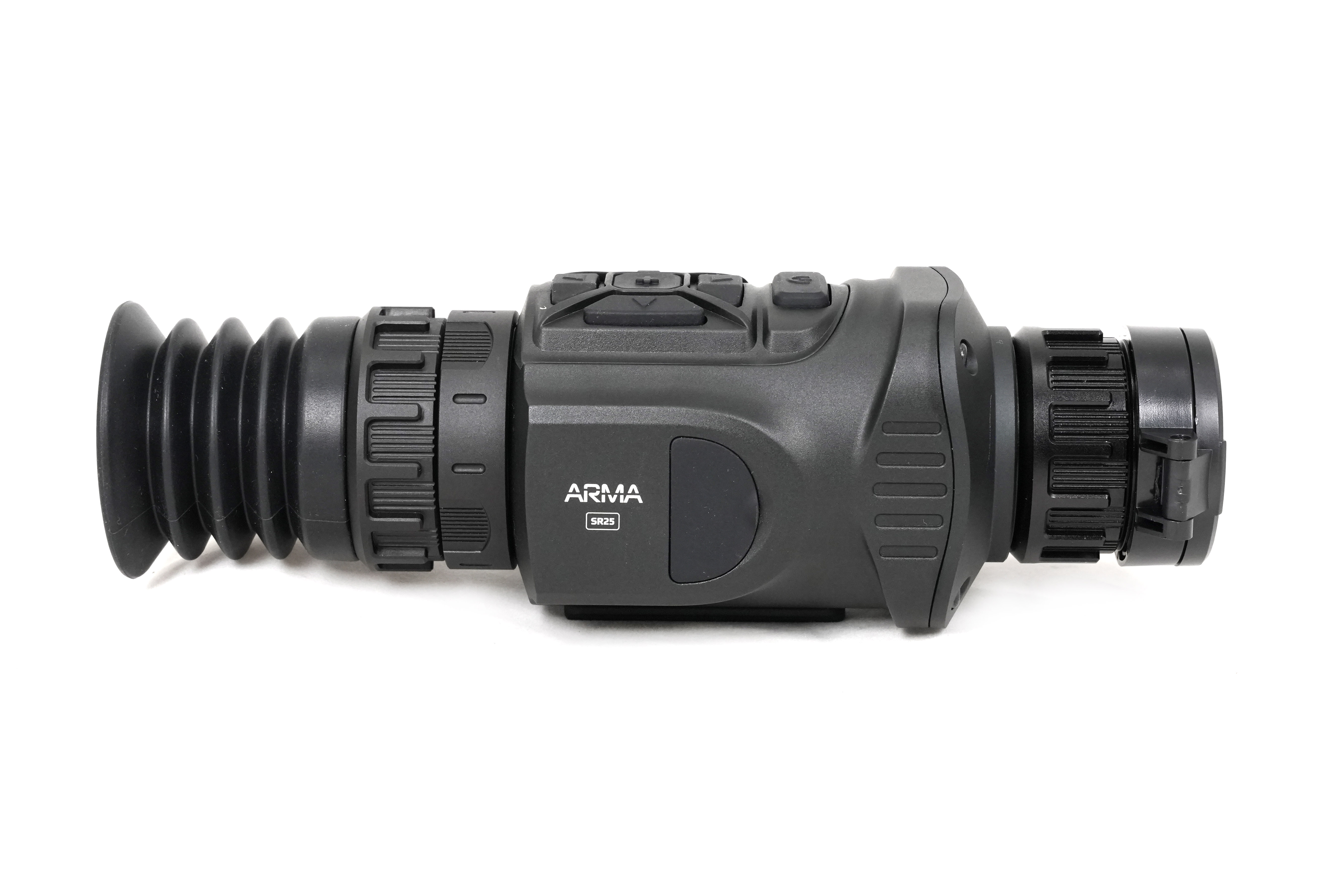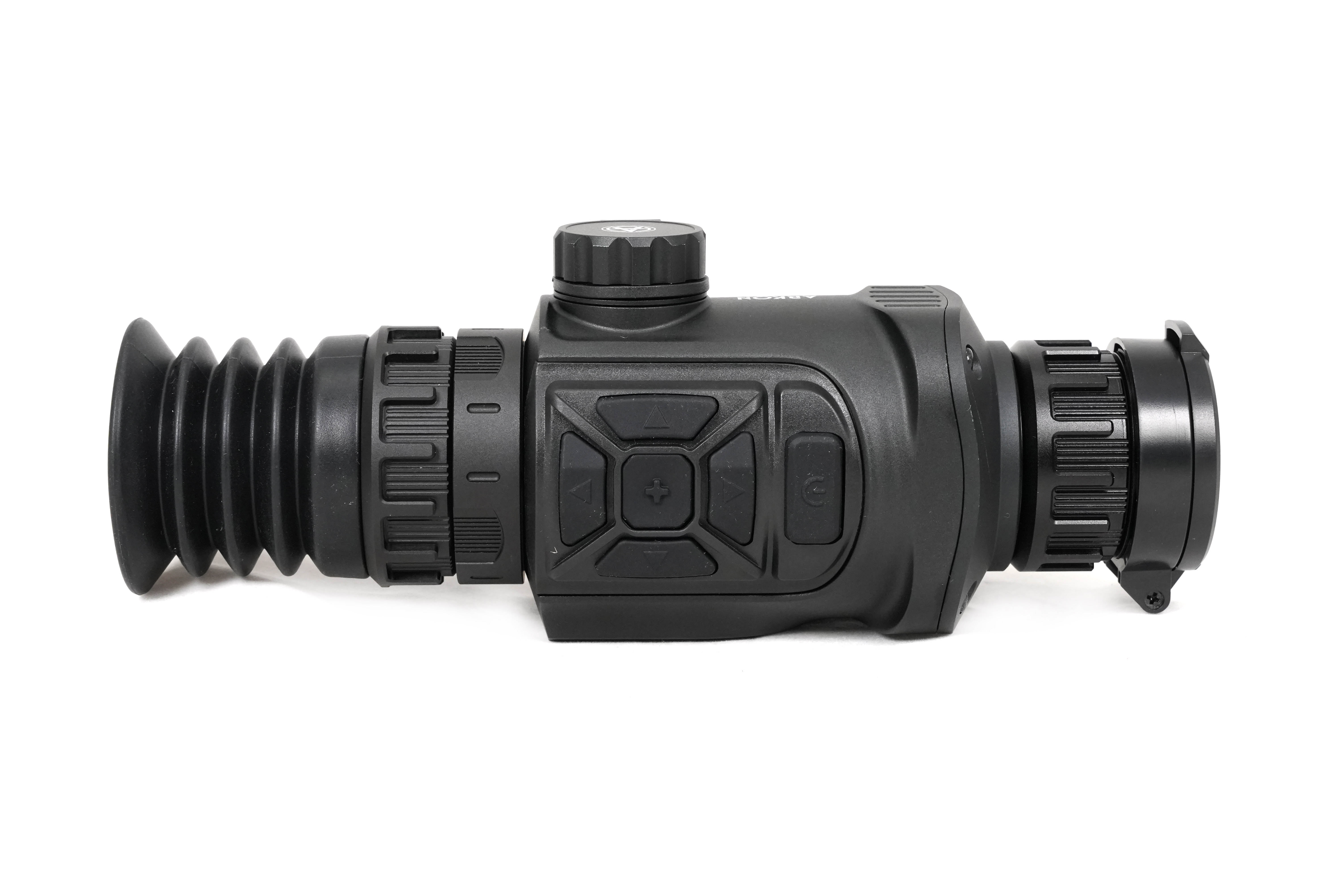 Прицел Arkon Arma SR25 оснащен германиевым объективом 25мм/F1.0, имеющем показатель базовой кратности 3,1х. Для масштабирования изображения имеется цифровая функция Digital zoom, доступная в пределах от 1х до 4х. Максимальное увеличение составит 12,4х. Угол пространственного поля зрения FOV (Field of view) на минимальной кратности равен 7.0°×5.4°. В линейных размерах стрелку будет видна область пространства размером 12,2 на 9,4 метра на удалении в 100 метров. Фокусировка на дистанцию выполняется вручную.