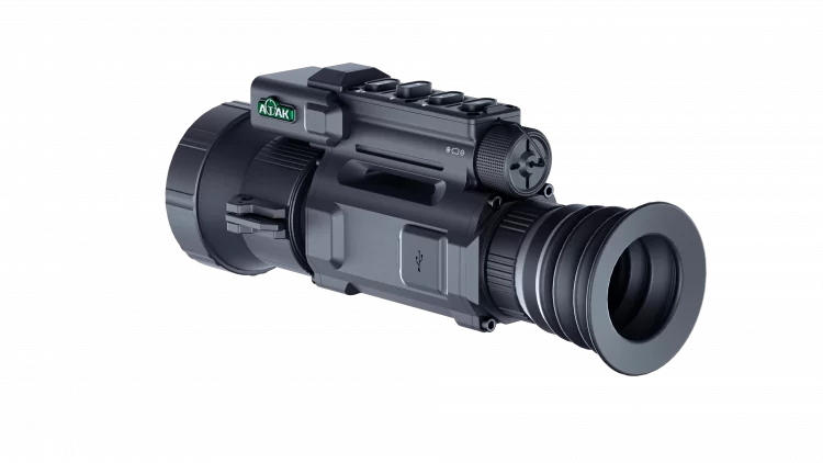 ATAK OT26-50LRF — прицел с матрицей VOx 640×512 (12 мкм, NETD 20 mK) и объективом F50 мм. Он уверенно работает в тумане, на холоде и по низкоконтрастным целям. Базовая кратность — 3,4×, цифровой зум пошаговый до 27,2×. Для дальних дистанций доступен встроенный лазерный дальномер до 1000 м и баллистический калькулятор, который выводит поправку прямо на сетке. Запись фото и видео со звуком ведётся на карту microSD, передача картинки — по Wi-Fi и USB-C. Корпус из алюминиевого сплава защищён по IP67 и выдерживает отдачу до 6000 Дж. Прицел обнаруживает крупную дичь до 2,6 км.