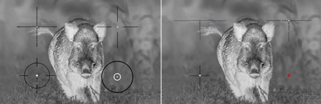 Набор из восьми прицельных сеток предоставляет уникальные возможности для решения любых тактических задач. При стрельбе на коротких дистанциях пользователи могут воспользоваться привычными охотничьими вариантами типа «Крест» или «Полукрест». При необходимости контролировать завал траектории полета пули на средних дистанциях, рекомендовано использовать тактические сетки типа Мил-Дот и его расширенные аналоги.
