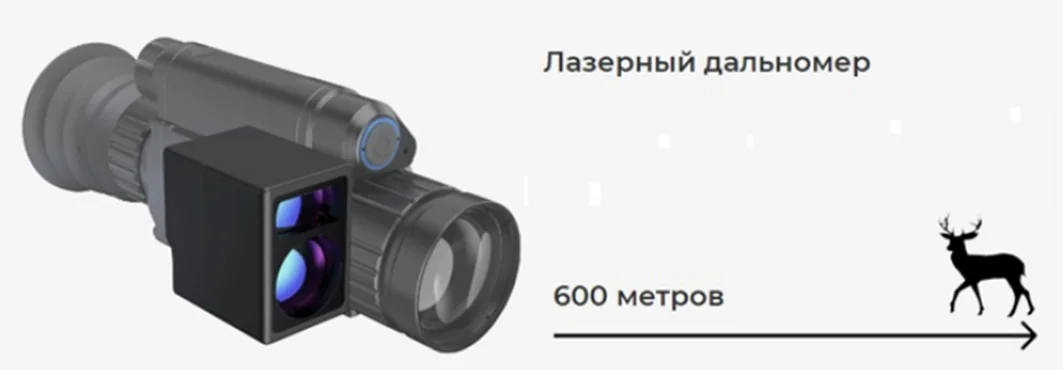 - Лазерный дальномер до 600 м, погрешность 0,5 м