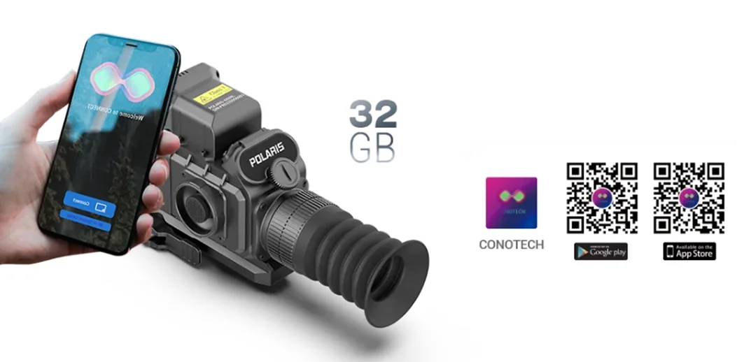 Прицел CONO Polaris-335RL оснащен встроенным рекордером, позволяющим производить запись всего, что попадает в поле зрения. Файлы сохраняются на встроенную карту памяти объемом 32 Гб. Скачать медиа-материалы можно по Wi-Fi или прямым кабельным соединением, подключив прицел к ПК.