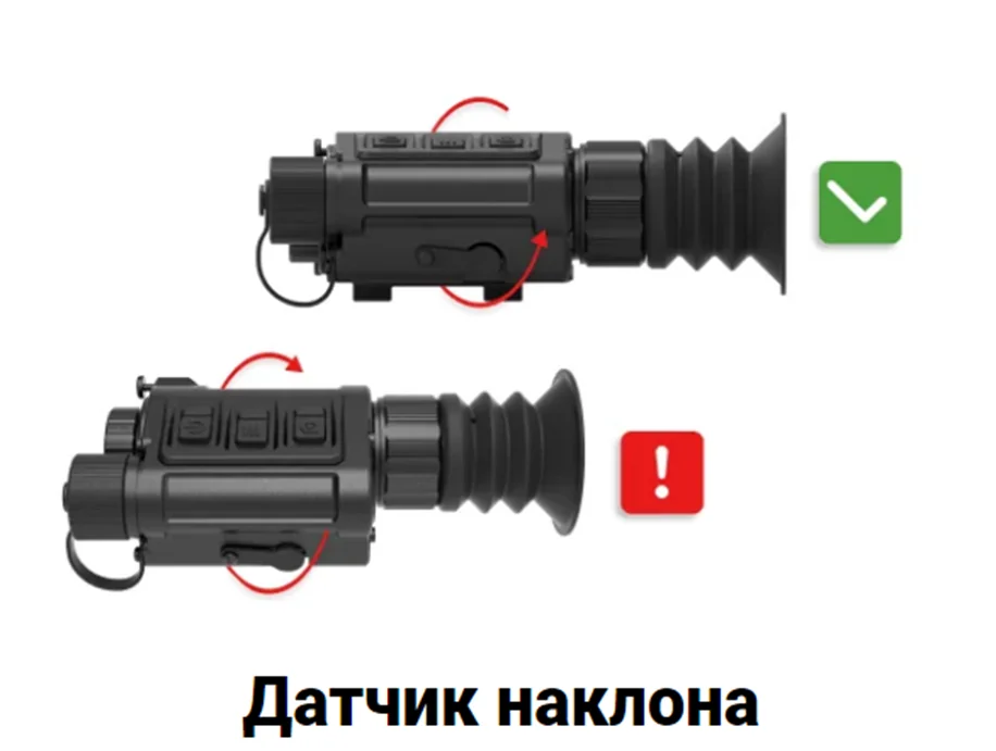 Встроенный акселерометр позволяет контролировать положение прицела относительно вертикального наклона и горизонтального завала. Для повышения точности стрельбы на дистанциях с учетом завала траектории полета боеприпаса, следует обращать внимание на показания датчиков.