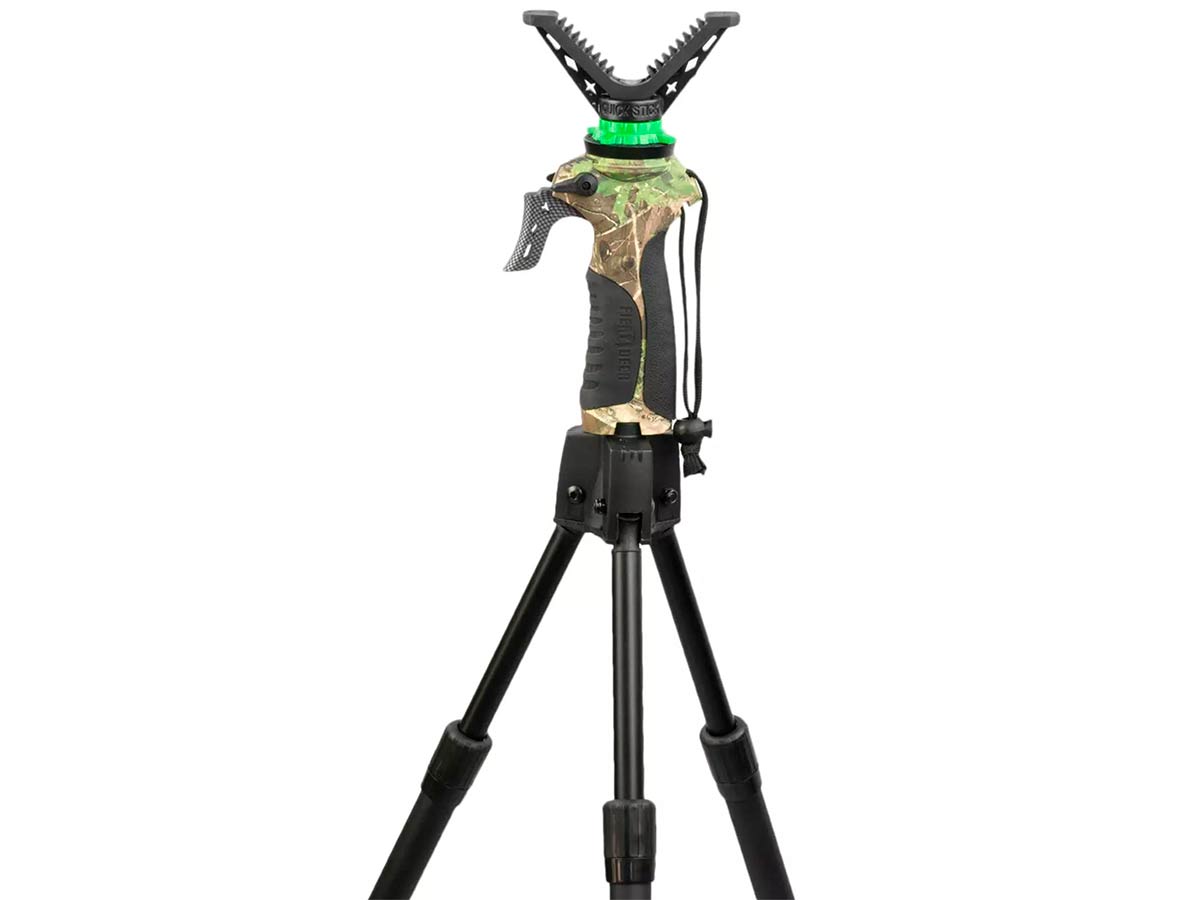 Упор устанавливается на подпружиненную резьбу 1/4"-20 UNC, под которой доступна также 3/8"-16 UNC — вы можете заменить его на камеру, телескоп, бинокль или другое оборудование. Поворотный на 360° V-образный упор надёжно удерживает винтовку, не повреждая ложу. Благодаря мягким насечкам вкладка осуществляется бесшумно. Благодаря камуфляжной расцветке трипод отлично маскируется в лесу, на болотах и в других природных условиях. Он не демаскирует стрелка и не бликует на солнце. Несмотря на прочную алюминиевую конструкцию, опора весит всего около 1 кг. Трипод быстро складывается и удобно переносится.