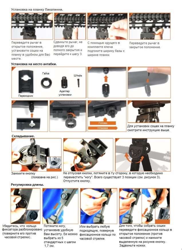 Это складные, регулируемые по высоте сошки. Могут устанавливаться на оружии, имеющем планкуWeawer/ Picatinny или на место антабки с помощью специального адаптера Swivel Stud Kit, который поставляется в комплекте. Используются для дополнительной фиксации ствола в направлении стрельбы и обеспечения повышения устойчивости оружия при стрельбе и, соответственно, кучности. Подходят для стрельбы лежа. Усиленная конструкция позволяет использовать изделие в вооруженных силах и правоохранительных органах.