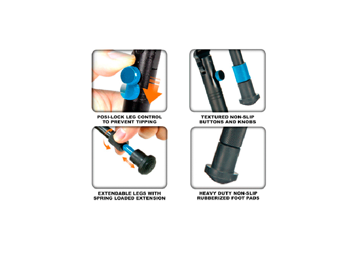 Это походные сошки для установки на ствол оружия диаметром от 10 мм до 19 мм. Сошки изготовлены из прочного алюминиевого сплава. Быстро отсоединяются и компактно складываются для транспортировки. Ножки сошек имеют скругленную форму на концах, рифленых для более устойчивого сцепления с поверхностью и обрезиненные. Сошки - регулируемые по высоте.