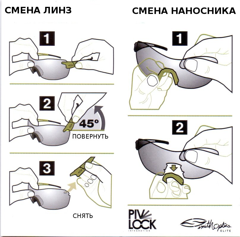 Запатентованная инновационная технология PivLock™ обеспечивает быструю и удобную замену линз с сохранением монолитности конструкции: съёмные дужки и наносник легко переставляются, не требуется никаких дополнительных крепёжных элементов. Всю необходимую информацию об очках и масках вы можете получить, позвонив нам по телефону или разместив вопрос на сайте нашего интернет-магазина.