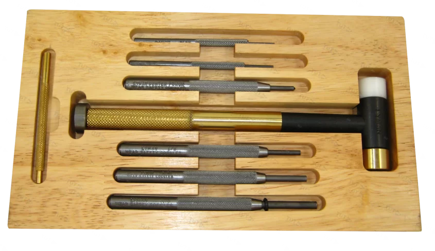 Набор включает молоток с тремя сменными головками (стальная, нейлоновая и латунная), латунный пробойник, а также выколотки 1/16", 3/32", 1/8", 5/32", 3/16" и 3/8". Комплект поставляется в специальном деревянном футляре.