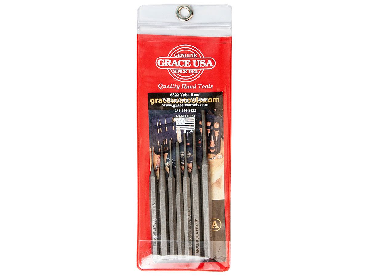 Набор выколоток Grace USA из 7 шт.Набор из выколоток для точечных работ. Выколотки изготавливаются из высокоуглеродистой стали Molybendenum Tool, а также тщательно обработаны и закалены по всей длине, обладают высокой ударопрочностью.Выколотки предназначены для «выколачивания» различных деталей, материалов и прочих частей. Как правило, применяется во время работы с деталями, которые имеют отверстия, в которые вставляются соответствующие крепежные элементы. Одна сторона стержня имеет утолщенную часть – это ударная часть выколотки, которая принимает на себя удары молотка. Другая же часть, несколько заужена на конце.ХарактеристикиАртикул: GR-PS-7Количество в наборе: 7 шт.Диаметр выколоток: 1,6 / 2 / 2,4 / 4 / 4,8 мм.Диаметр площадки: 1,6 мм.Конус: острыйМатериал: СтальУпаковка: Чехол