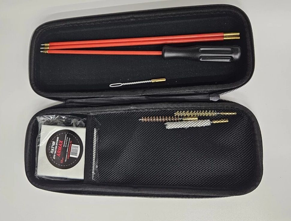 В комплекте: металлопластиковый шомпол, 3 ерша, вишер-адаптер, патчи, тканевые салфетки, EVA-футляр. Совместимость: малокалиберные винтовки под 5,6 мм.