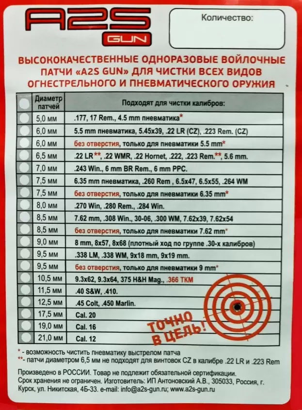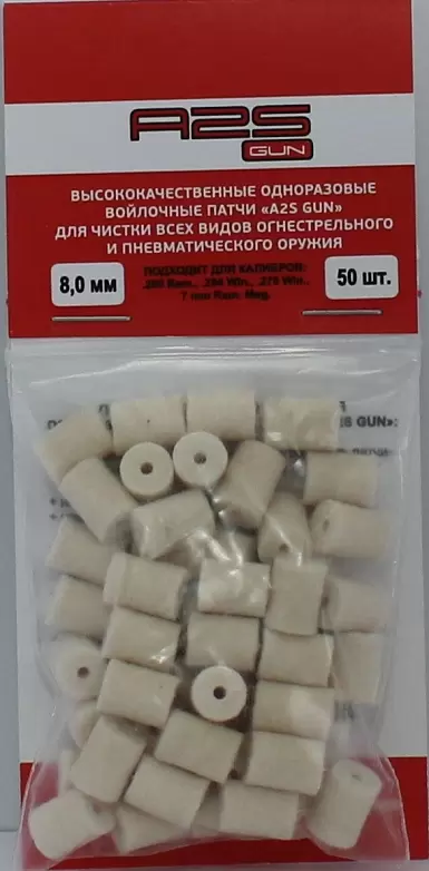 Войлочные патчи A2S GUN, диаметр 8.0 мм, 50шт./уп. предназначены для чистки нарезного оружия калибров .280 Rem., .284 Win., .270 Win., 7 mm Rem. Mag.