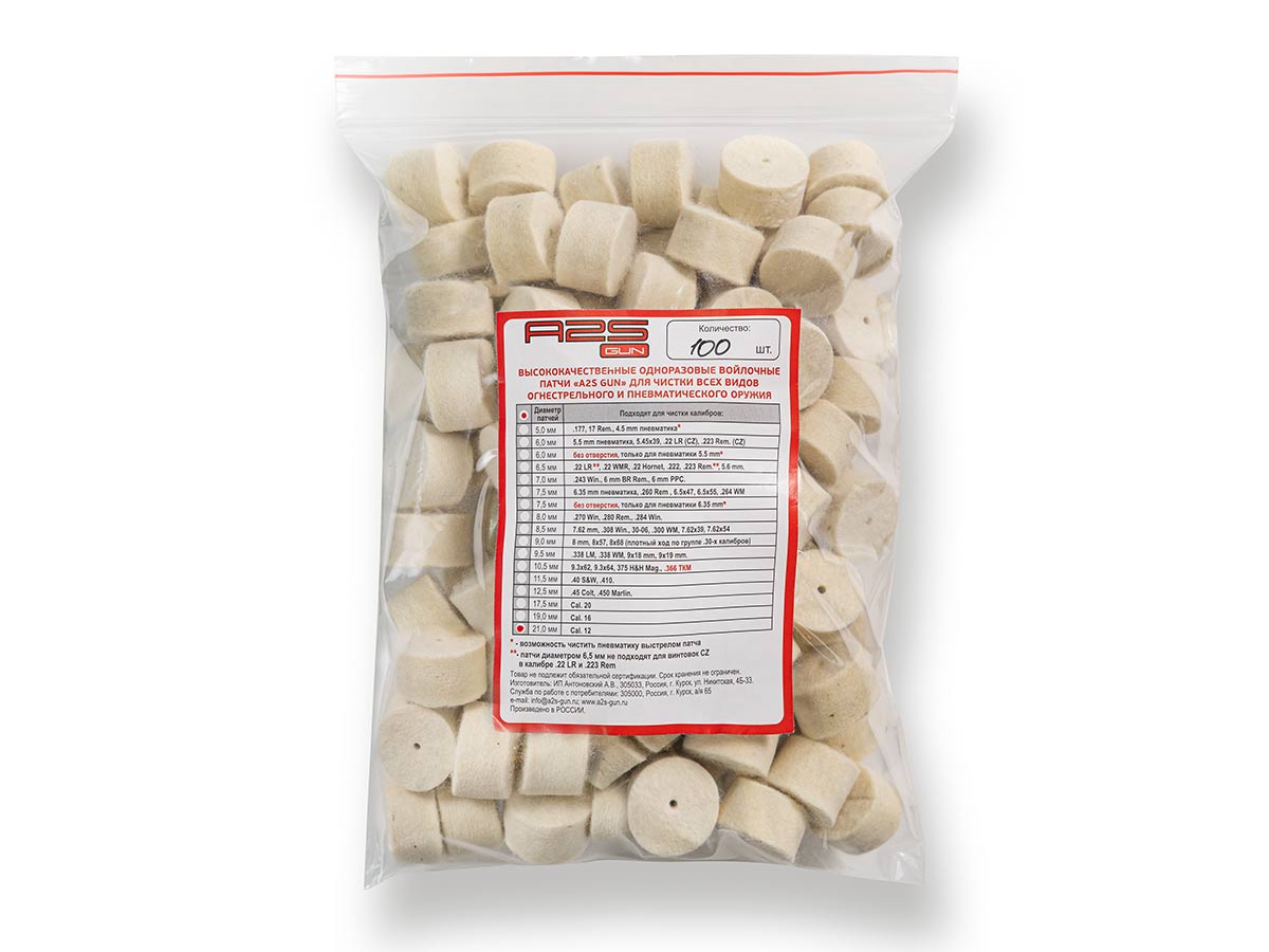 Войлочные патчи A2S GUN, Ø 21 мм, 100шт./уп. предназначены для чистки гладкоствольного оружия 12 калибра (Cal. 12).