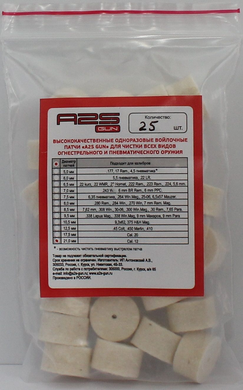 Войлочные патчи A2S GUN, диаметр 21 мм, 25шт./уп. предназначены для чистки гладкоствольного оружия 12 калибра (Cal. 12).