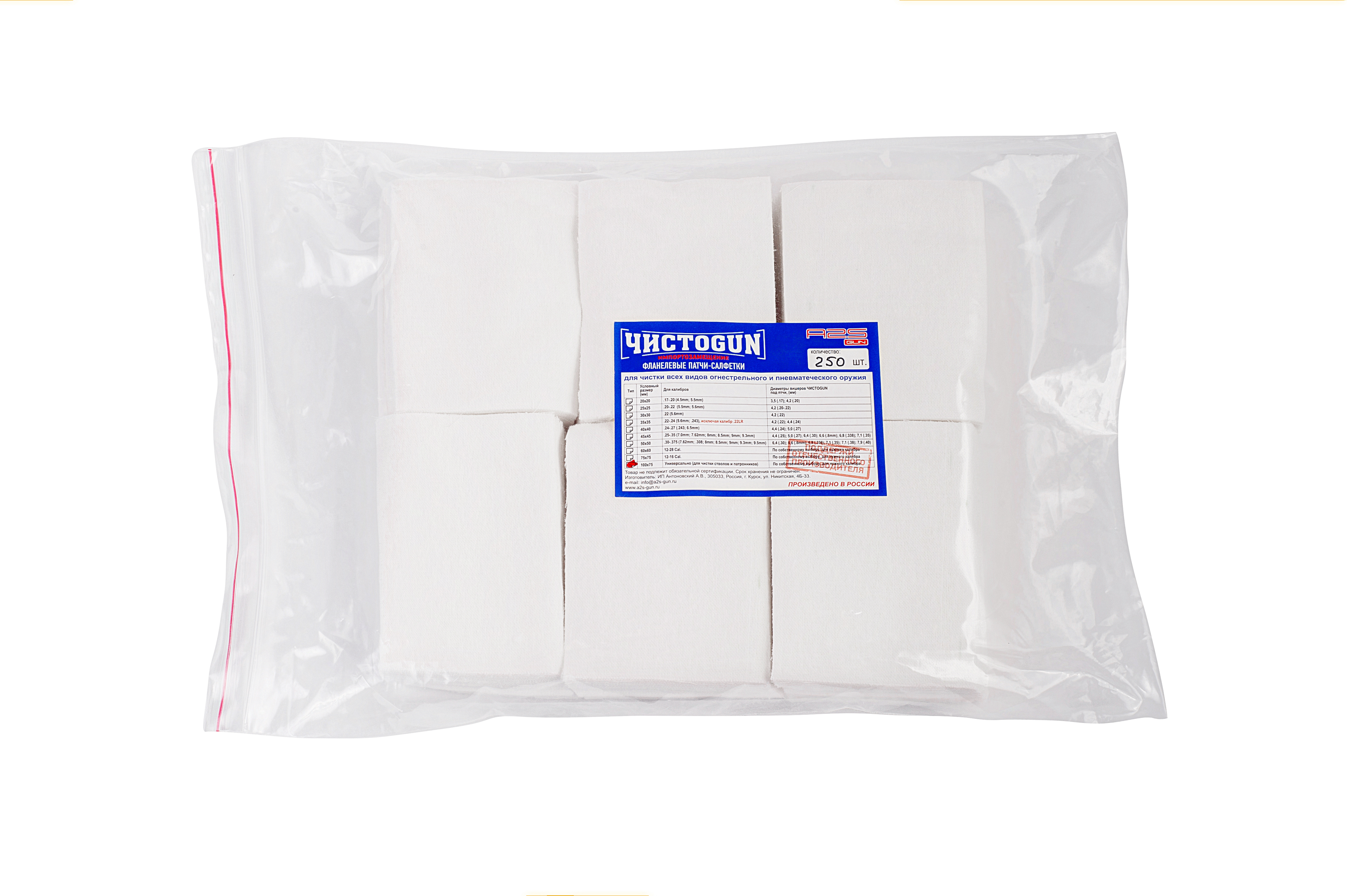 Патчи ЧИСТОGUN фланель, универсальный, прямоугольник 100х75 мм, 250 шт., белый