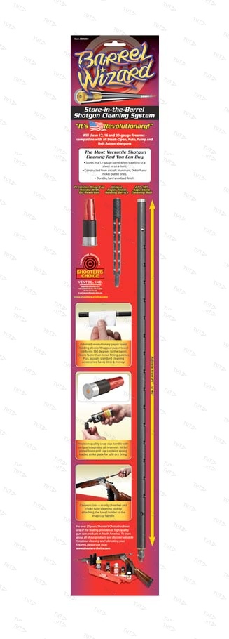 Shooter's Choice Barrel Wizard Shortgun Cleaning System. Универсальный, телескопический шомпол с вишером. В рукояти шомпола вмонтирована масленка. Не требует обязательной сертификации Хранить в недоступном для детей Производитель: Ventco, Inc | Shooter's Choice 15050 Berkshire Industrial Pkwy Middlefield, OH 44062 Tel. (440) 834-8888fax: (440) 834-3388 Произведено в США