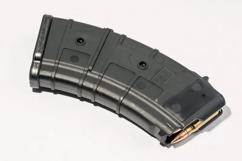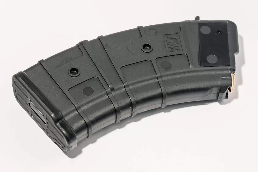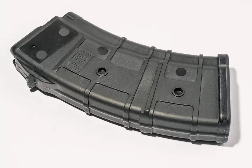 Кроме шероховатой поверхности, внешние стенки покрыты рисунком-протектором, не дающим магазину скользить в руках. Магазин легко разобрать. Утопив кнопку фиксатора тыльной крышки, вы можете легко снять ее и получить доступ для чистки и обслуживания.