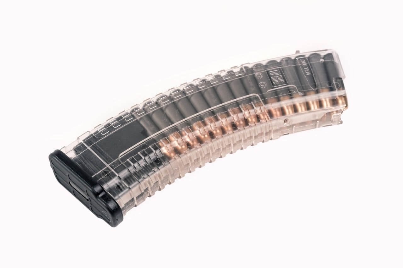 Рассчитан на 30 мест. Прозрачное исполнение позволяет контролировать кол-во оставшихся патронов. Кроме шероховатой поверхности, внешние стенки покрыты рисунком-протектором, не дающим магазину скользить в руках. Магазин легко разобрать. Утопив кнопку фиксатора тыльной крышки, вы можете легко снять ее и получить доступ для чистки и обслуживания.