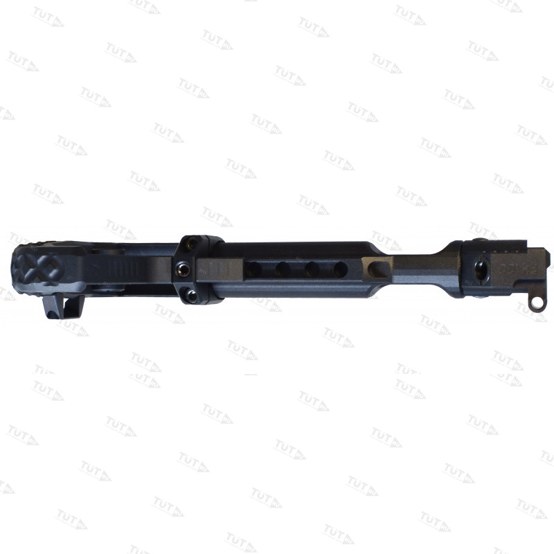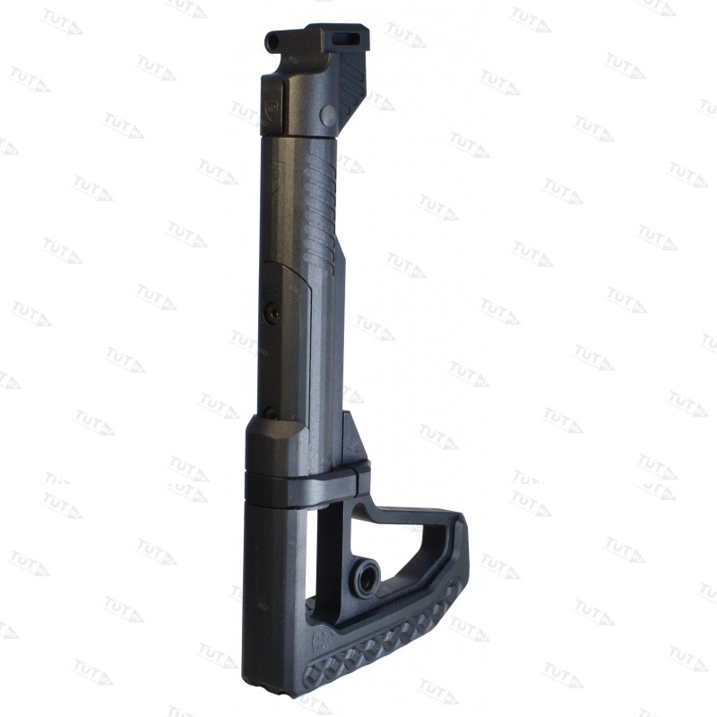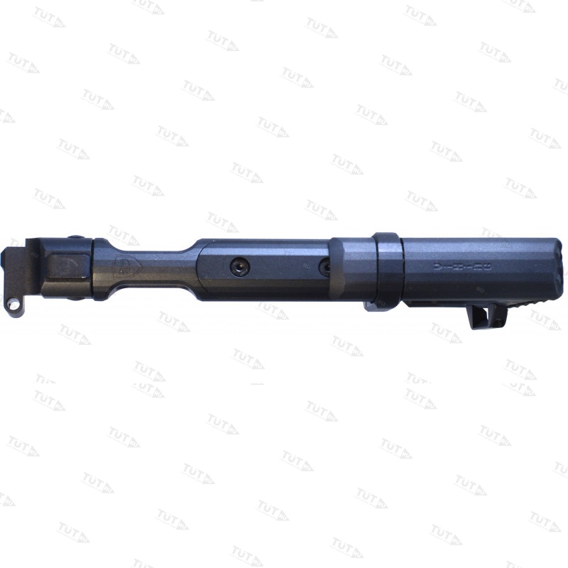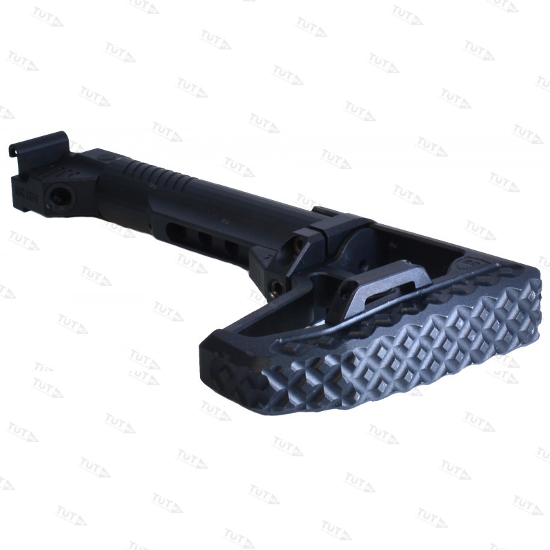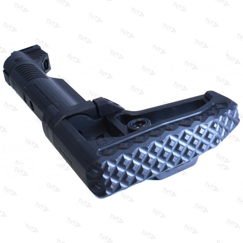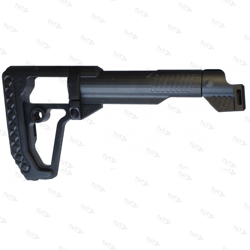 Приклад цельнофрезерованный из алюминиевого сплава. В задней части приклада размещены двухстороннее гнездо QD антабки и скоба защелки приклада. Не рекомендуется использовать скобу, как место крепления ремня, во избежание отрыва под большой нагрузкой. При желании скобу можно демонтировать.