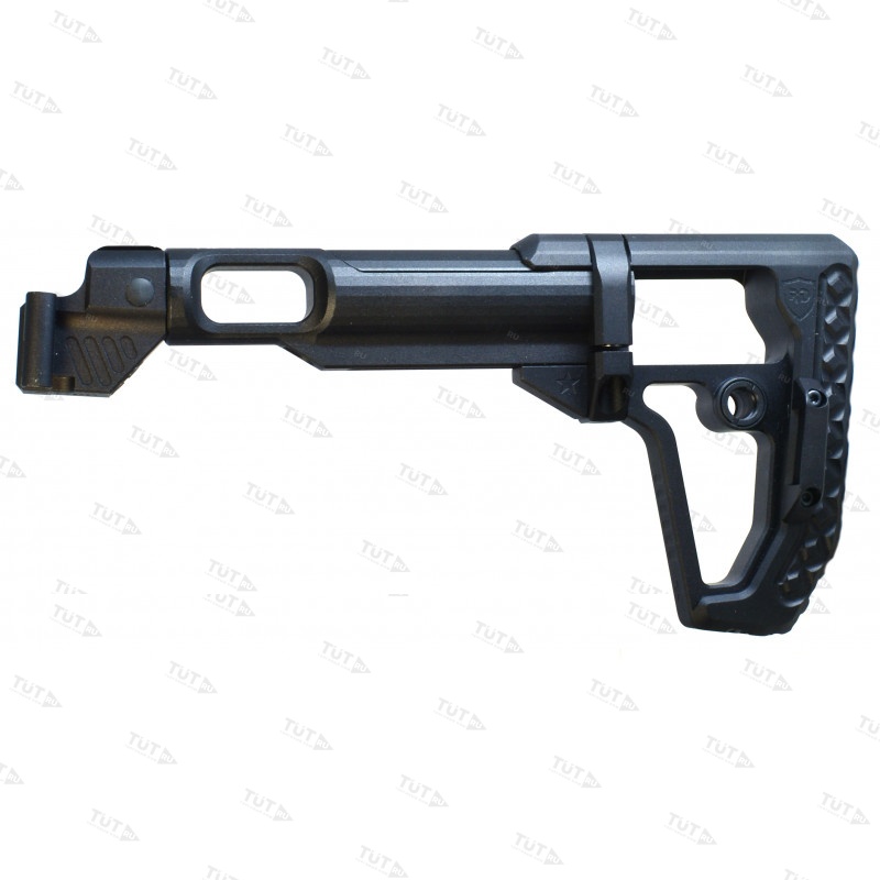 Приклад цельнофрезерованный из алюминиевого сплава. В задней части приклада размещены двухстороннее гнездо QD антабки и скоба защелки приклада. Не рекомендуется использовать скобу, как место крепления ремня, во избежание отрыва под большой нагрузкой. При желании скобу можно демонтировать.