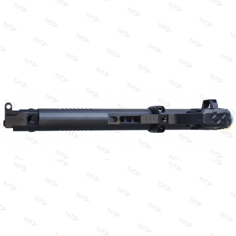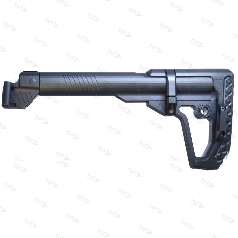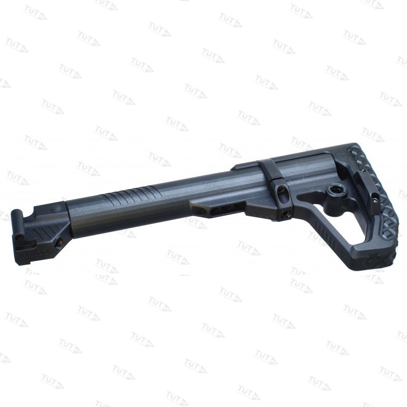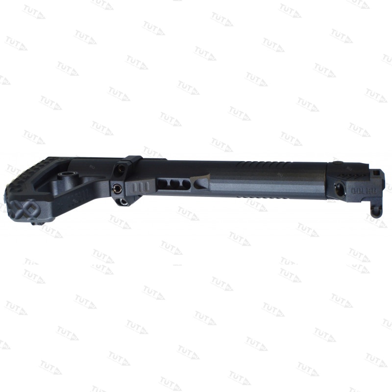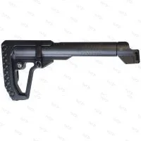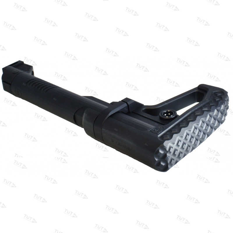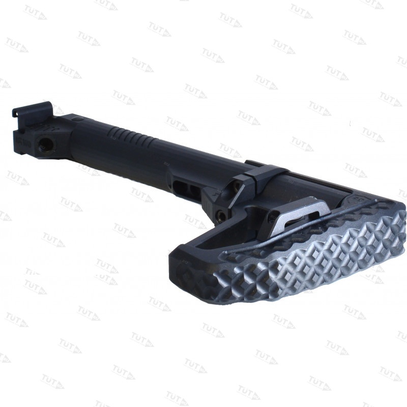 Приклад цельнофрезерованный из алюминиевого сплава. В задней части приклада размещены двухстороннее гнездо QD антабки и скоба защелки приклада. Не рекомендуется использовать скобу, как место крепления ремня, во избежание отрыва под большой нагрузкой. При желании скобу можно демонтировать.