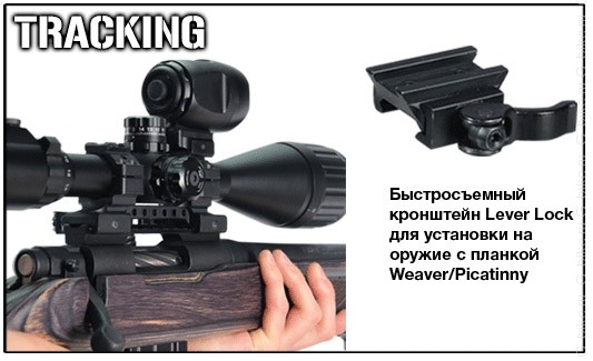 В комплекте имеется быстросъёмный кронштейн с системой быстрой установки Lever Lock на планку Weaver/Picatinny.